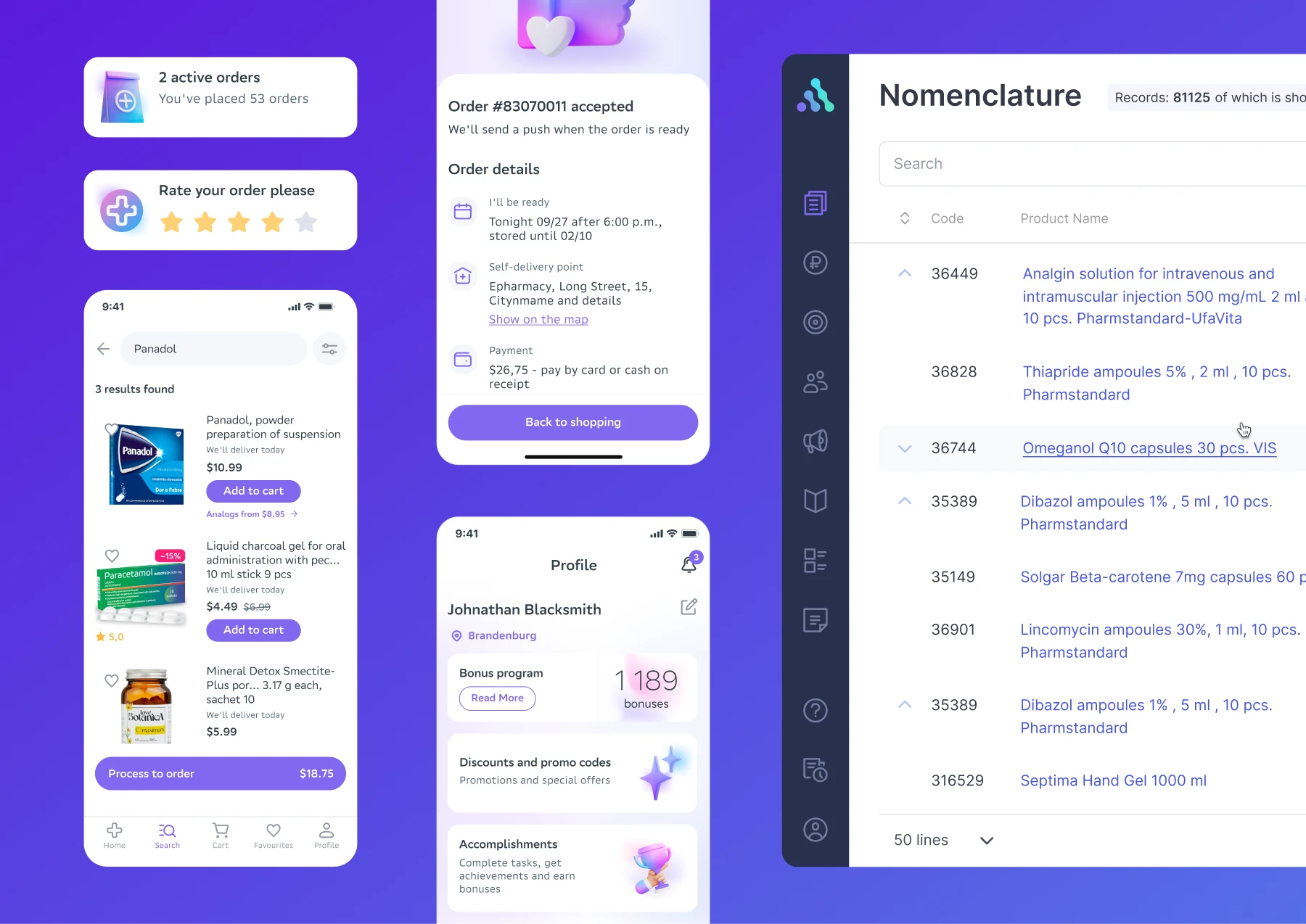 Headed up Design Team of 10+ UX designers and product design direction in a large pharmacy e-com. The products were varied and covered all business needs, including the web and mobile client sides, the back office, the administration portal, the partner service, and the logistics portal.